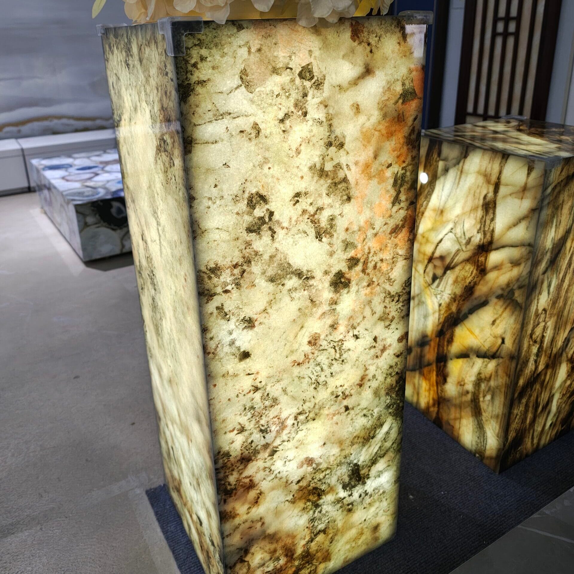 When paired with LED lighting systems, the stone’s inner glow reveals intricate color layers and organic patterns, providing a warm and luxurious ambiance.